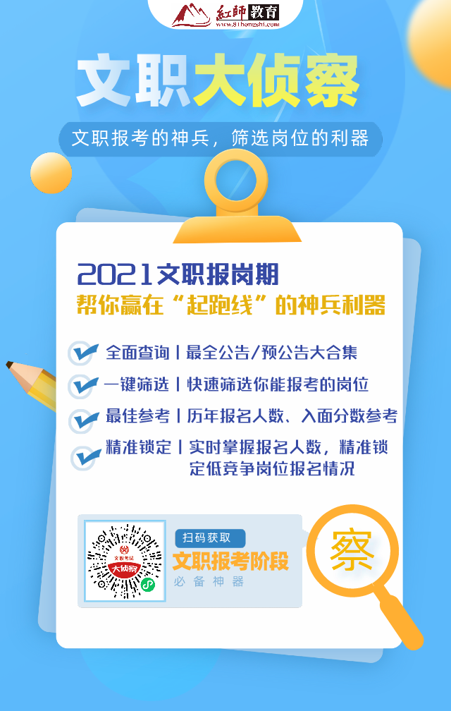 2021年,为了给文职学员提供更加专业的服务,红师教育正式将“文职大侦察”工具开放给所有文职备考学员!在微信小程序中搜索“文职大侦察”或者点击下方文职大侦察图片,就可免费使用!