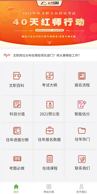 2021-03-25 19:50:54备考军队文职不仅是智商之争,还有勤奋和方法!为了帮助广大红师学员更好更轻松的备考军队文职,红师教育组建了由退役专家教授组成的科研团队,投入了大量财力,集智攻关,反复论证,独家研发了“文职大侦察”!