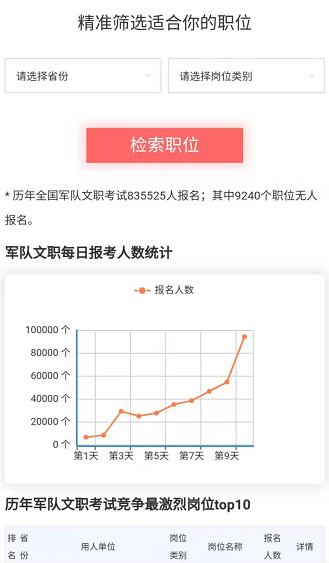 “往年报名数据”模块在2021年选岗期间,可以变身选岗利器,及时更新的2021年各岗位报名人数,能够帮助文职考生科学选岗,避免扎堆!