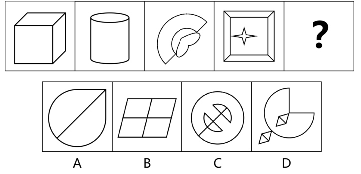 90.答案:D。解析:元素组成不同,优先考虑属性规律。观察发现,题干图形均为轴对称图形,考虑对称轴的方向和数量。题干图形均只有一条对称轴,并且对称轴的方向依次逆时针旋转,故?处应选择只有1条竖对称轴的图形,且对称轴方向为斜向右上的,排除B项。继续观察,发现题干图形中对称轴经过图形面的个数分别为1、2、3、4,故?处应选择对称轴经过5个面的图形,A项经过0个面,C项经过1个面,D项经过5个面,只有D项符合。故本题答案为D。