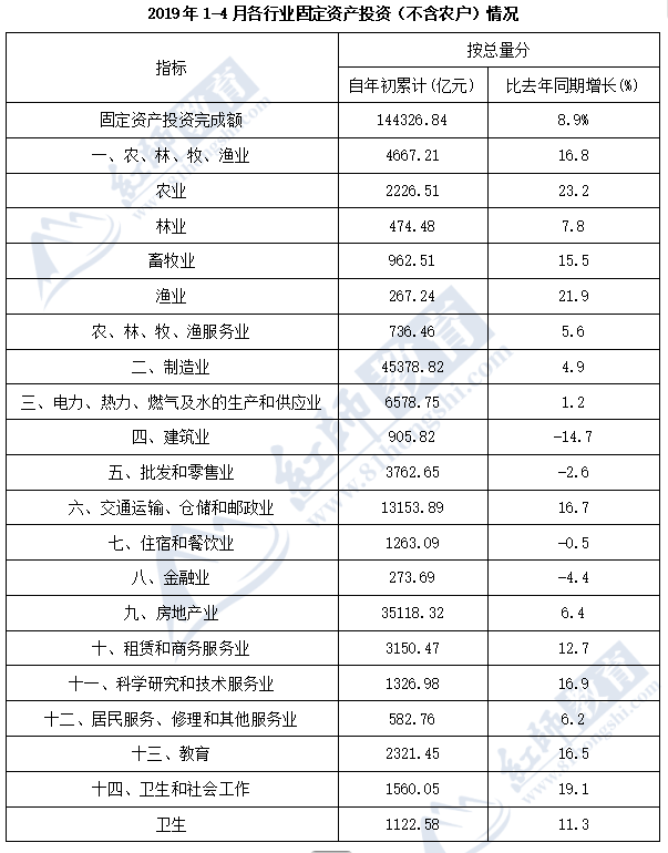 110. 2018年1-4月农、林、牧、渔业行业中固定资产投资(不含农户)最大行业在2019年1-