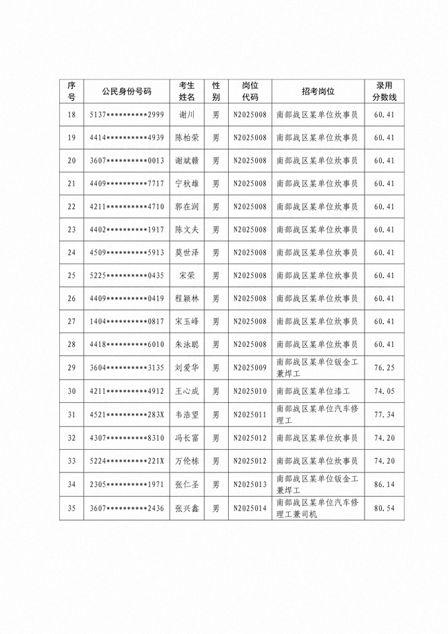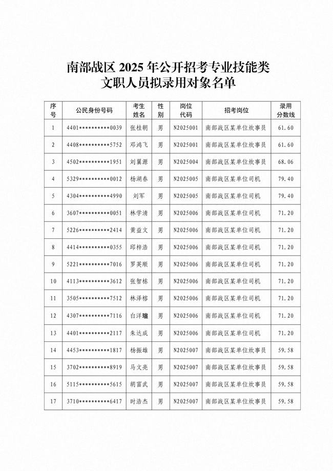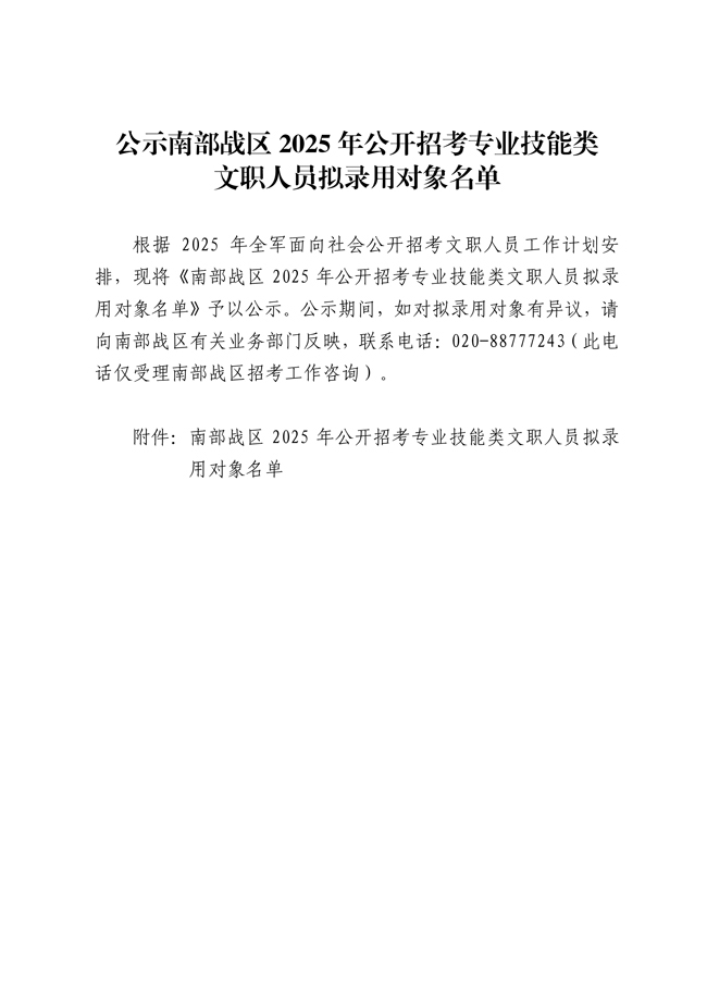原文标题:公示南部战区2025年公开招考专业技能类文职人员拟录用对象名单