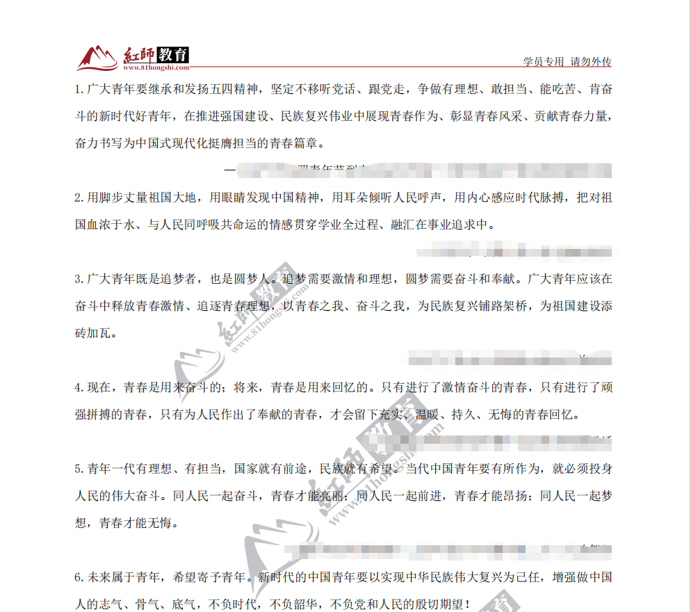 5.青年一代有理想、有担当,国家就有前途,民族就有希望。当代中国青年要有所作为,就必须投身人民的伟大奋斗。同人民一起奋斗,青春才能亮丽:同人民一起前进,青春才能昂扬;同人民一起梦想,青春才能无悔。
