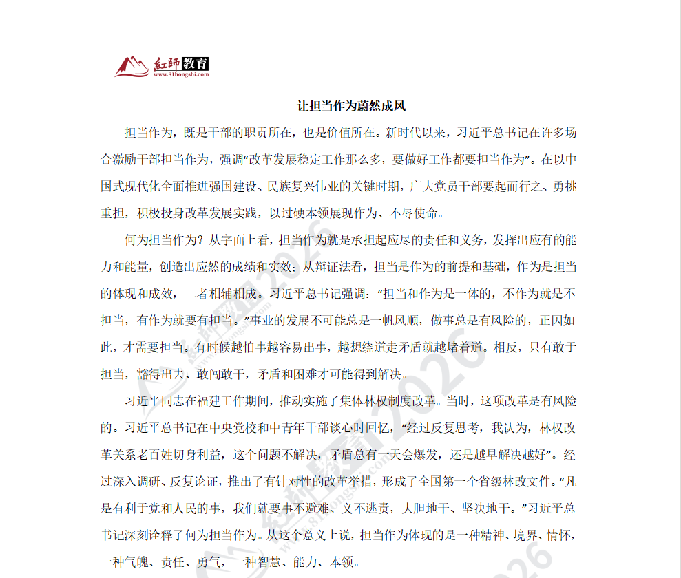 2026-01-09 15:16:08担当作为,既是干部的职责所在,也是价值所在。新时代以来,习近平总书记在许多场合激励干部担当作为,强调"改革发展稳定工作那么多,要做好工作都要担当作为"。在以中国式现代化全面推进强国建设、民族复兴伟业的关键时期,广大党员干部要起而行之、勇挑重担,积极投身改革发展实践,以过硬本领展现作为、不辱使命。