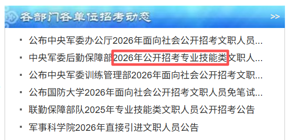 2026年1月4日8时06分军队人才网发布了中央军委后勤保障部2026年技能岗的招考公告,此次共招考112个岗位,招录419人。