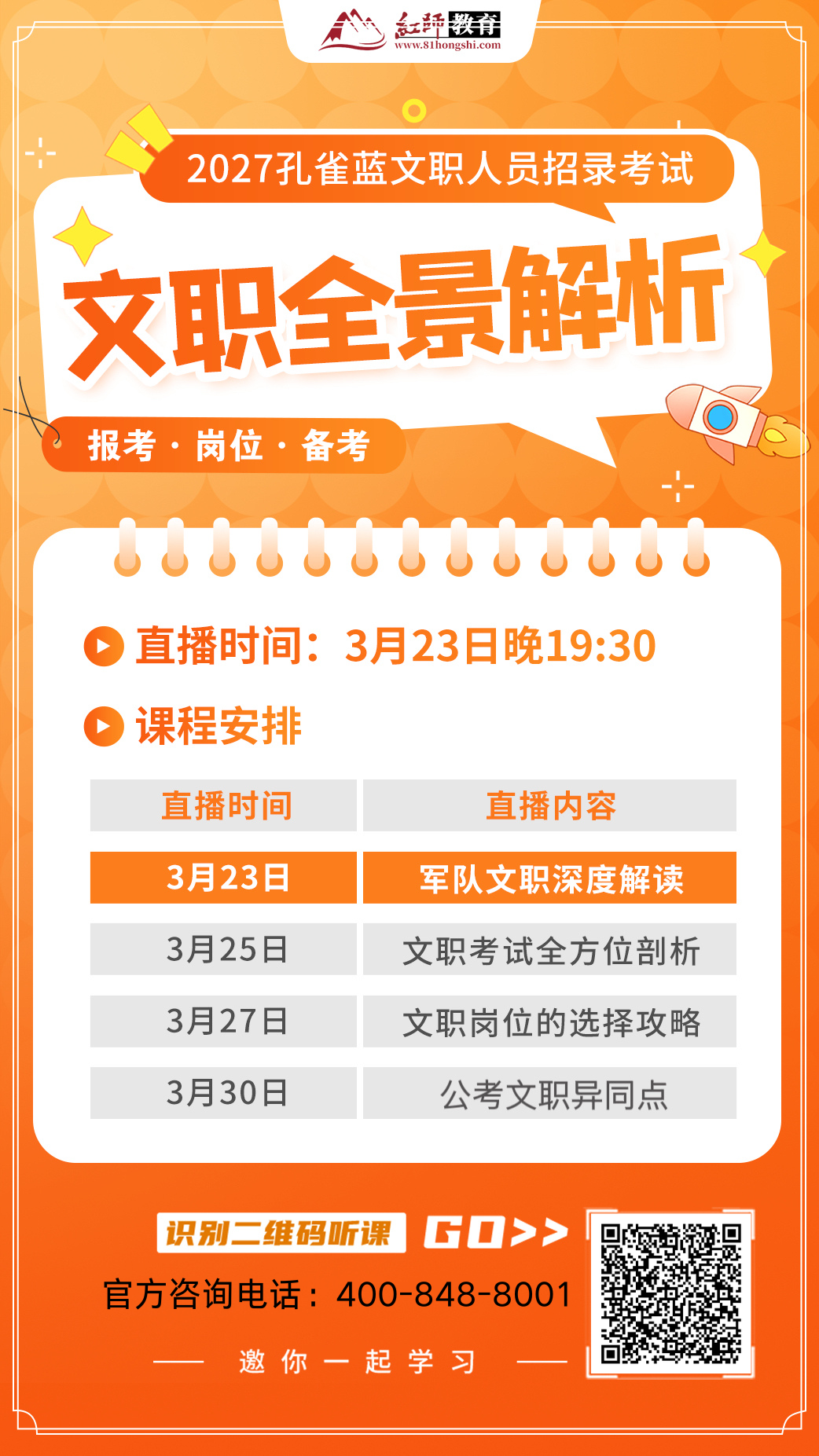 2027 年军队文职招录考试备考已全面启动,为帮助广大考生清晰把握报考政策、科学筛选岗位、高效规划备考节奏,红师教育特别推出「文职全景解析」系列公益直播课,从政策解读到应试技巧,全方位为文职备考之路保驾护航。